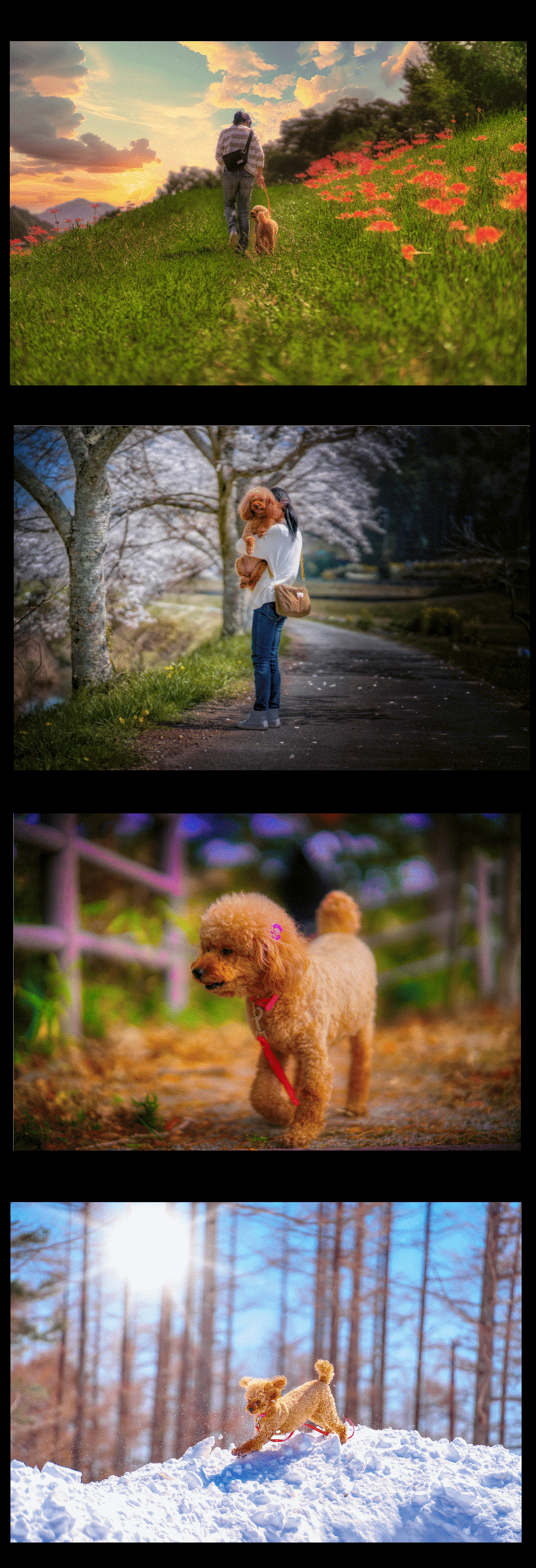 ドッグミルキーは、貴方と愛犬の思い出を映します。 いつもの散歩道 お気に入りの公園 思い出の風景 懐かしい情景など ご指定の場所で撮影後 レタッチを行い作品に仕上げます。 … …